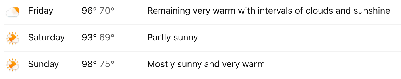 Well, Friday’ll be a scorcher—’round 96, maybe more if that sun don’t quit. Saturday cools off just a hair, but don’t let that fool ya, it’s still hot enough to melt the vinyl off your truck seat. Sunday? Right back up near 98, so best get your outside chores done early and plan to sit still after lunch. Mornings are your friend this weekend—rest of the day, you’ll be sweatin’ like a sinner in church.